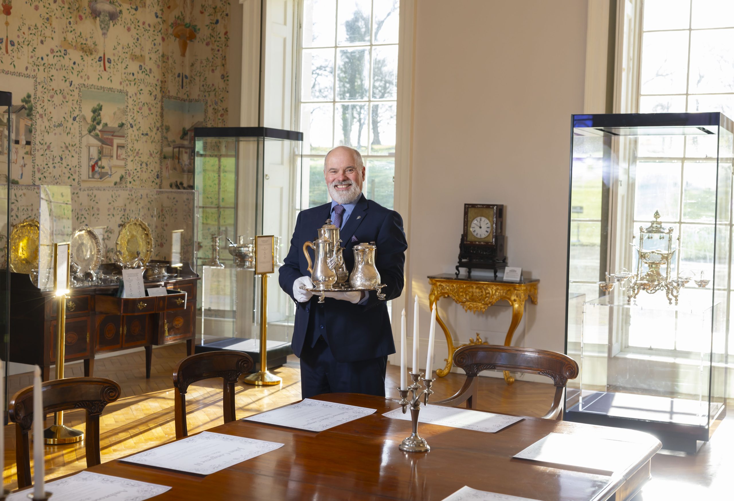 This is a 60-minute guided experience, delivered in two parts. Inside the House (approx. 20 minutes) Begin in the Large Drawing Room, also known as the Chinese Room. Lined with rare, hand-painted Chinese wallpaper, this remarkable interior reflects 18th-century wealth, global trade, and taste. A carefully selected group of Irish silver dining and service pieces reveals how hospitality was staged through ceremony, control, and skilled labour. Mount Congreve was famously the last house in Ireland to employ liveried servants, giving particular depth to an experience shaped by hierarchy, discipline, and performance. In the Gardens (approx. 40 minutes) The experience then continues outdoors with a guided walk through selected garden areas. This section shows how the estate sustained the table—supplying produce, shaping after-dinner movement, and reinforcing the social rituals of the Big House. This is not a conventional house tour, but a focused, immersive experience that connects interior splendour with the working landscape beyond, bringing the elegance—and the hidden labour—of the Big House into sharp focus.
